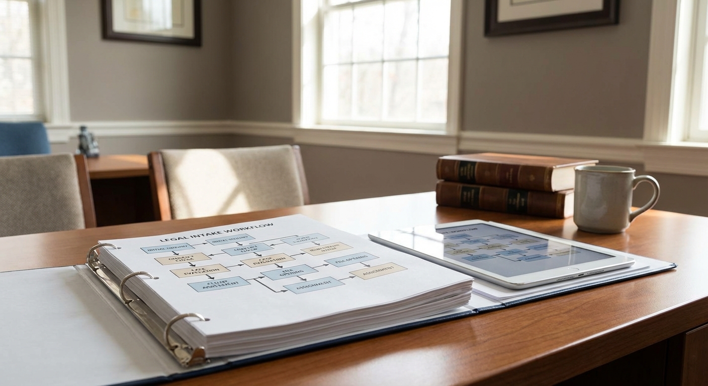 Professional office with step-by-step process flowchart or intake process document